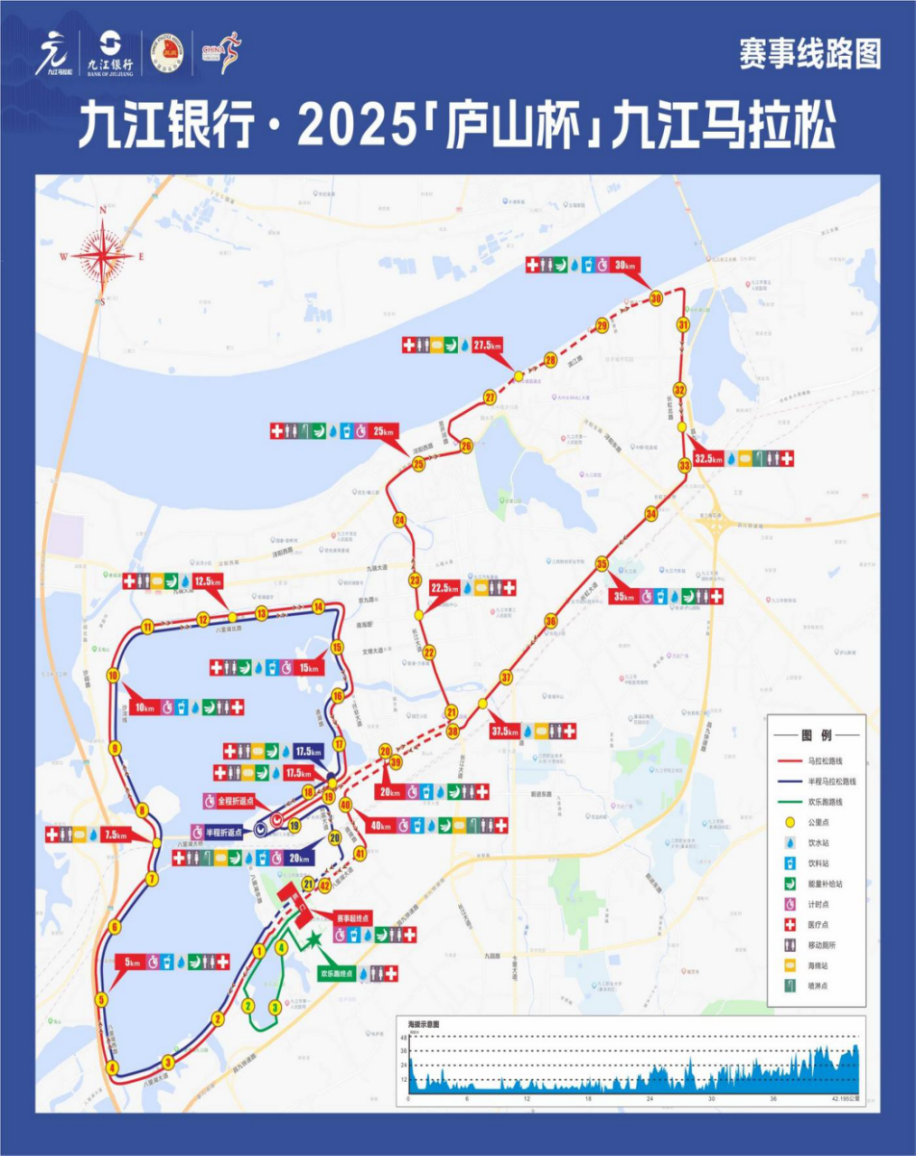 全程马拉松线路:九江市政府北侧(起点)-八里湖大道-八里湖西路-沙浔线-八里湖北路-兴业大道-通湖路-长虹西大道-折返点(半岛宾馆入口处)-长虹西大道-长江大道-浔阳西路-龙开河路-滨江路-长虹北路-长虹大道-长虹西大道-通湖路-八里湖大道-九江市政府北侧(终点)