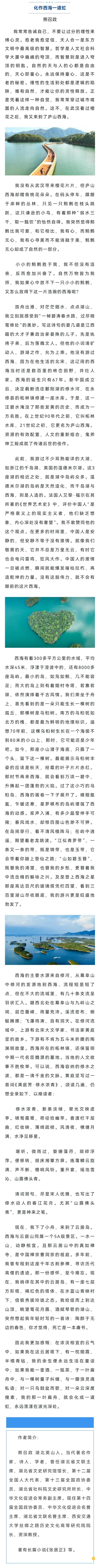 这句浸润着诗意的文字,来自著名作家熊召政发表于人民日报的文章《化作西海一道虹》。当他的笔尖轻触西海的土地,便是以心为舟,在湖光山色间放逐灵魂——让每一棵树成了蓬勃的火焰,让每一朵翻涌的浪花化作心灵的诗行。