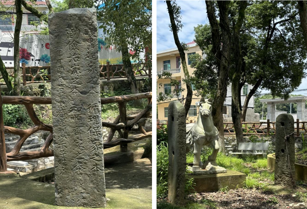 左图为程霄家族家训古碑、右图为程霄家族古系马桩